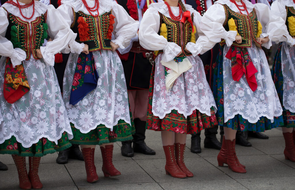 なんといっても民族舞踊は衣装がカラフルですよね。ポーランドの民族衣装は地方によって時代によって、たくさんの種類があります。お花の刺繍や模様がスカートの裾やブラウスの袖などにたくさんついていて、見ているだけでワクワクします。デザインが可愛らしいだけでなく、どこか素朴な雰囲気がとっても癒されます。